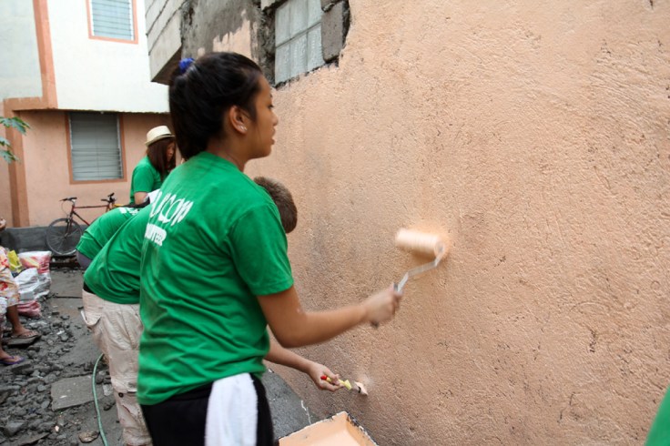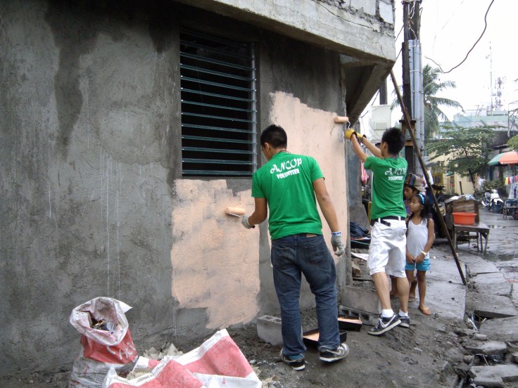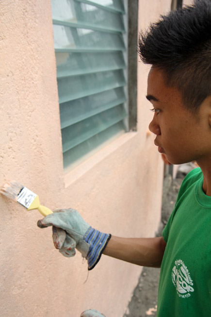 Now off to the build site for our last day work. Â Today’s goal- paint the entire lower exterior walls we plastered 2 days earlier.