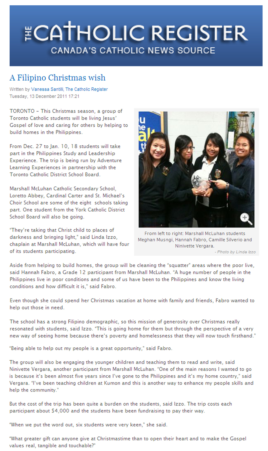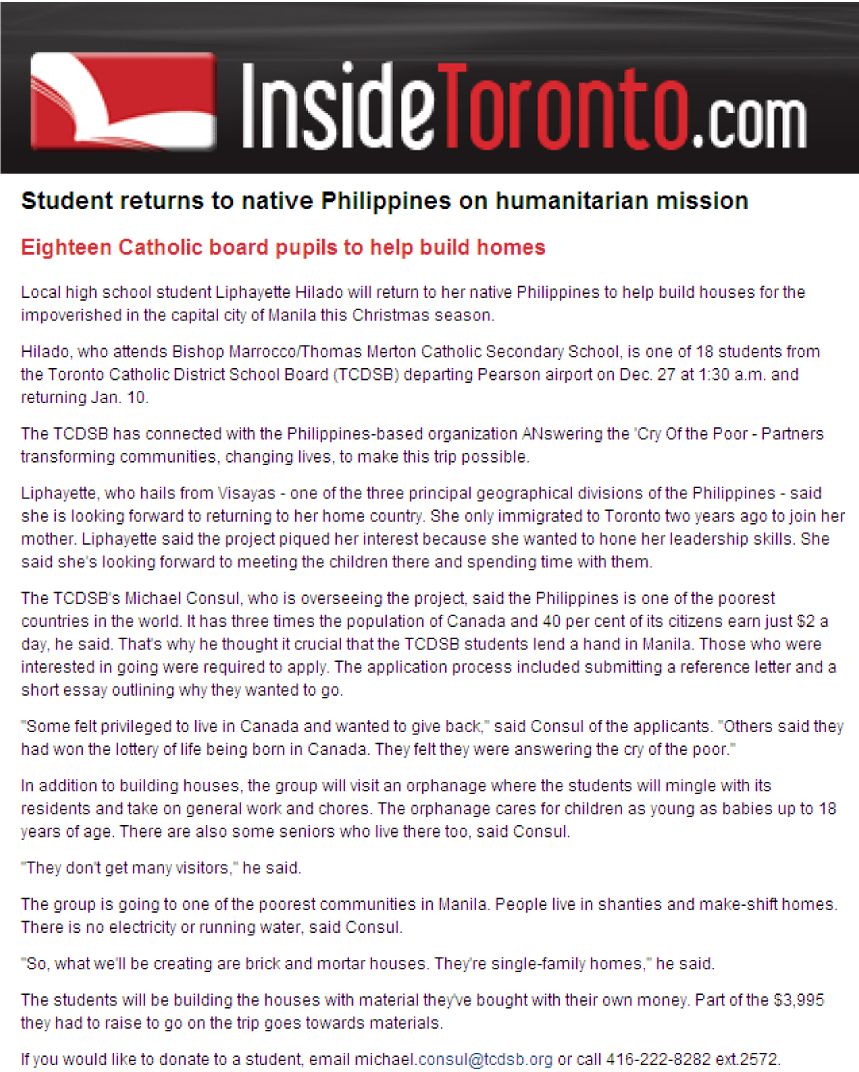 News Articles – We’re in the News! Below will be a list of articles written about our trip to the Philippines. Article – Inside Toronto Article – Catholic Register Share this: Click to share on X (Opens in new window) X Click to share on Facebook (Opens in new window) Facebook Like Loading... Related Leave a comment Cancel reply Δ