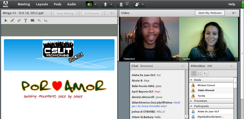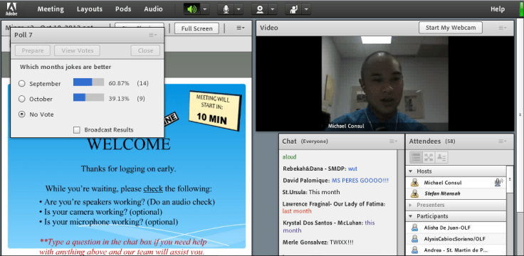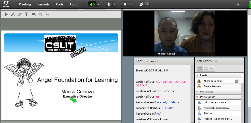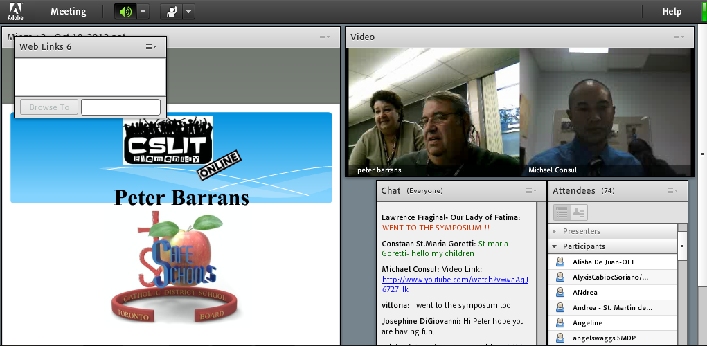 On Thursday, November 18, 2012, E-CSLIT went online for their second time! Students across the Toronto Catholic District School Board began to log on to partake in the pre-show at 3:00 p.m. The team of Michael & Chase Consul, Theresa Hoang (chair of E-CSLIT), Stefan Ntansah (Co-op student), and Dan Lee (guest appearance) prepared jokes and activities until the meeting official started at 3:45 p.m. Over seventy participated in this online meeting where guest speakers and esteemed board members graciously presented.