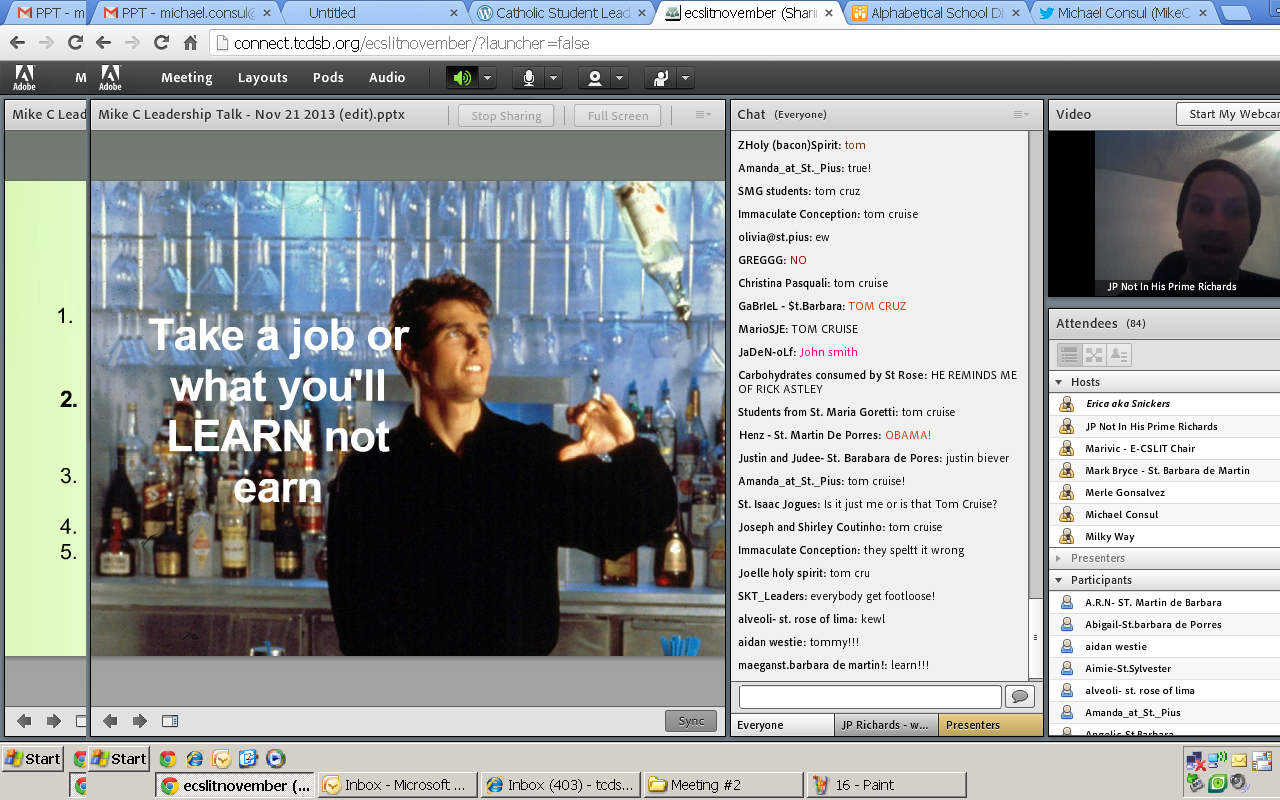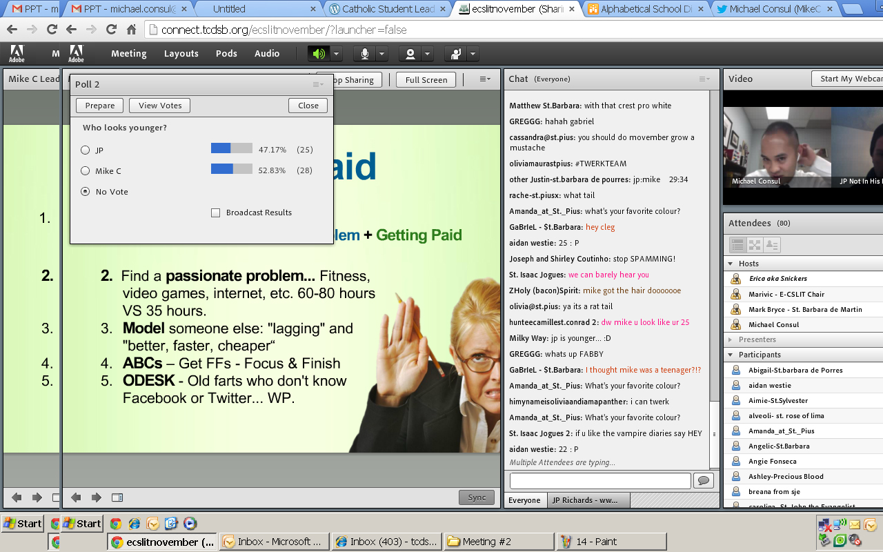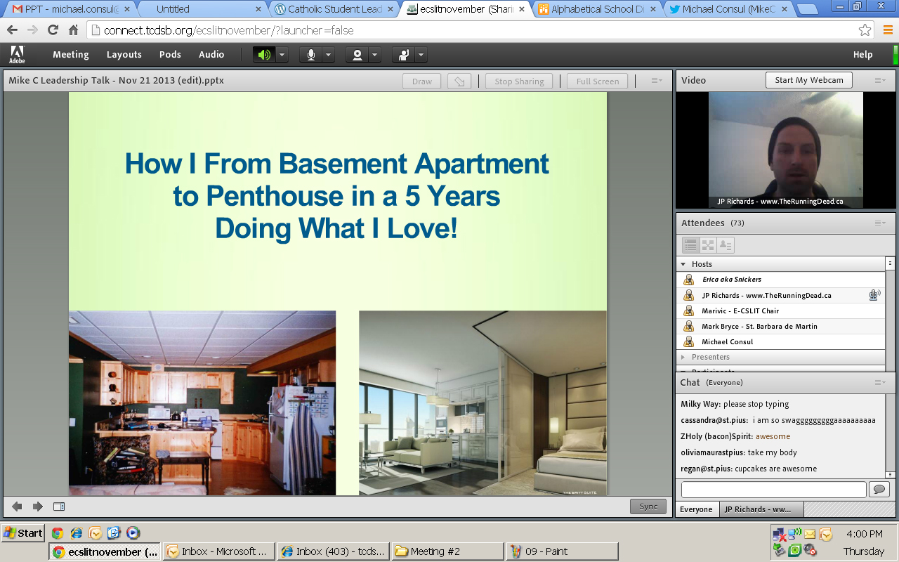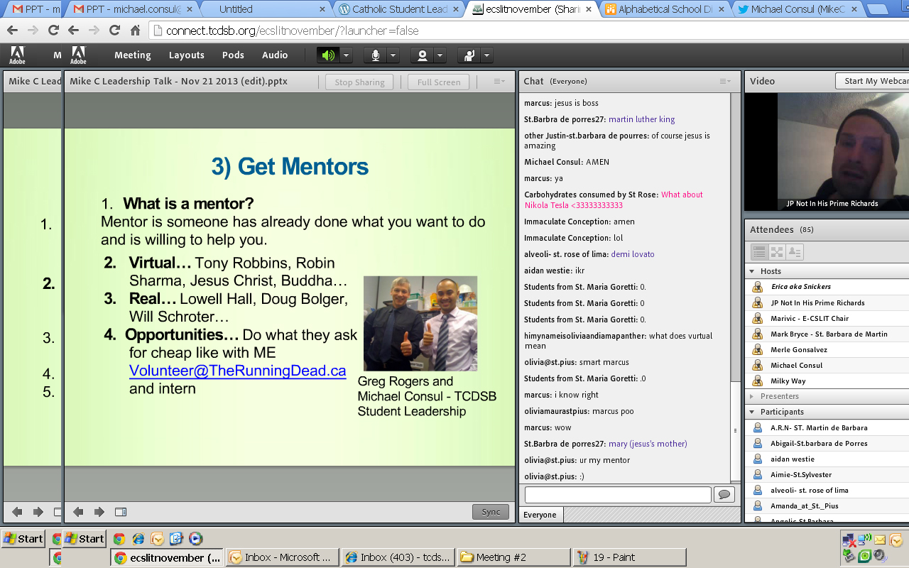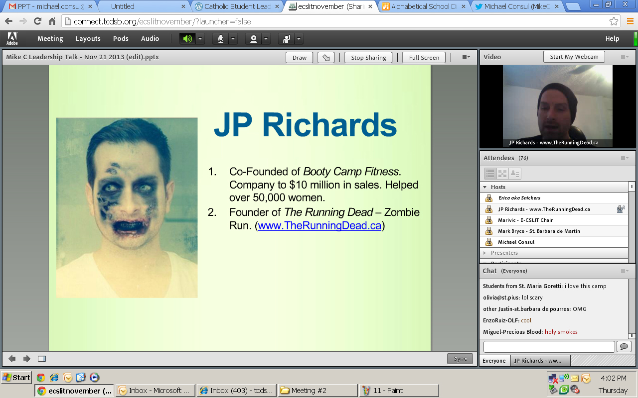 Everyone was AMAZED by Mike’s magic trick. Including me!Mike introduces our guest speaker: JP Richards! (Do you remember who he is? Hint: Look at the first online meeting post ;))Welcome JP Richards to our online Minga!JP Richards explains who he is!Believe it or not but that’s JP. Amongst other things, JP is the founder of Running Dead (Toronto Zombie Walk)JP Richards tells everyone the four keys of success!The first key to success: Get Paid for something you LOVE doing. “Pay” could come in the form of knowledge, fun, experience, contacts, and opportunity.There was a poll asking “Who do you think is younger? Mike or JO?” And E-CSLIT voted Mike C is younger! Do you agree?The second key to success: Solve other people’s problems.“Take a job for what you’ll LEARN not earn.” Knowledge and experience is more important than money. (Do you know who that man is in the picture? Leave a comment below)The third key to success…. can you name it?Who are YOUR mentors? Leave a comment below!Two great examples of mentors are…… MIKE AND GREG 🙂A quick recap of all the keys to success. Thank you so much JP for speaking and sharing your knowledge and experience.Time for the game: 16 questions. Snickers asks, “What is November’s virtue of the month?”It’s the Milky Way asking “What is Mike’s twitter?” (Follow @MikeCLeadership for knowledge, insight and motivation)Mike asks the last question……it seems like this last question is becoming a tradition.Time for student best practice! St. Martin De Porres shares some of the awesome leadership initiatives they are doing at their school.