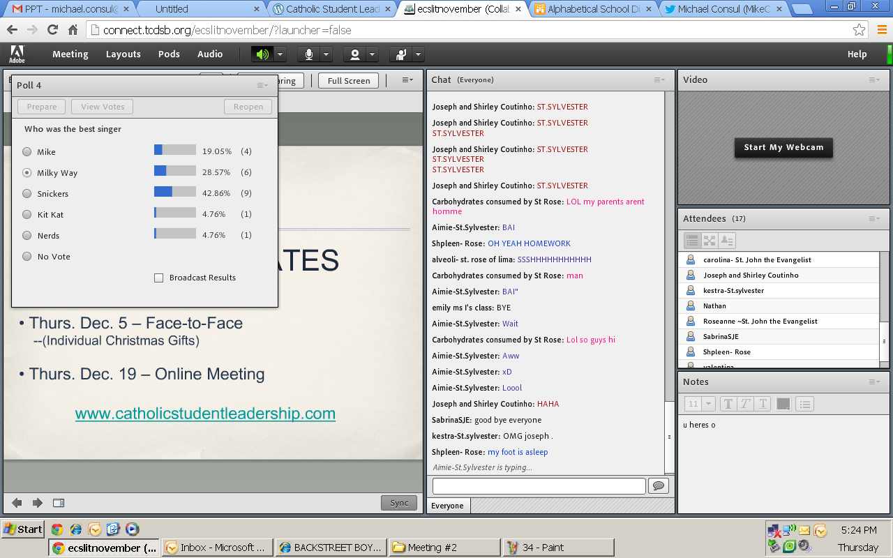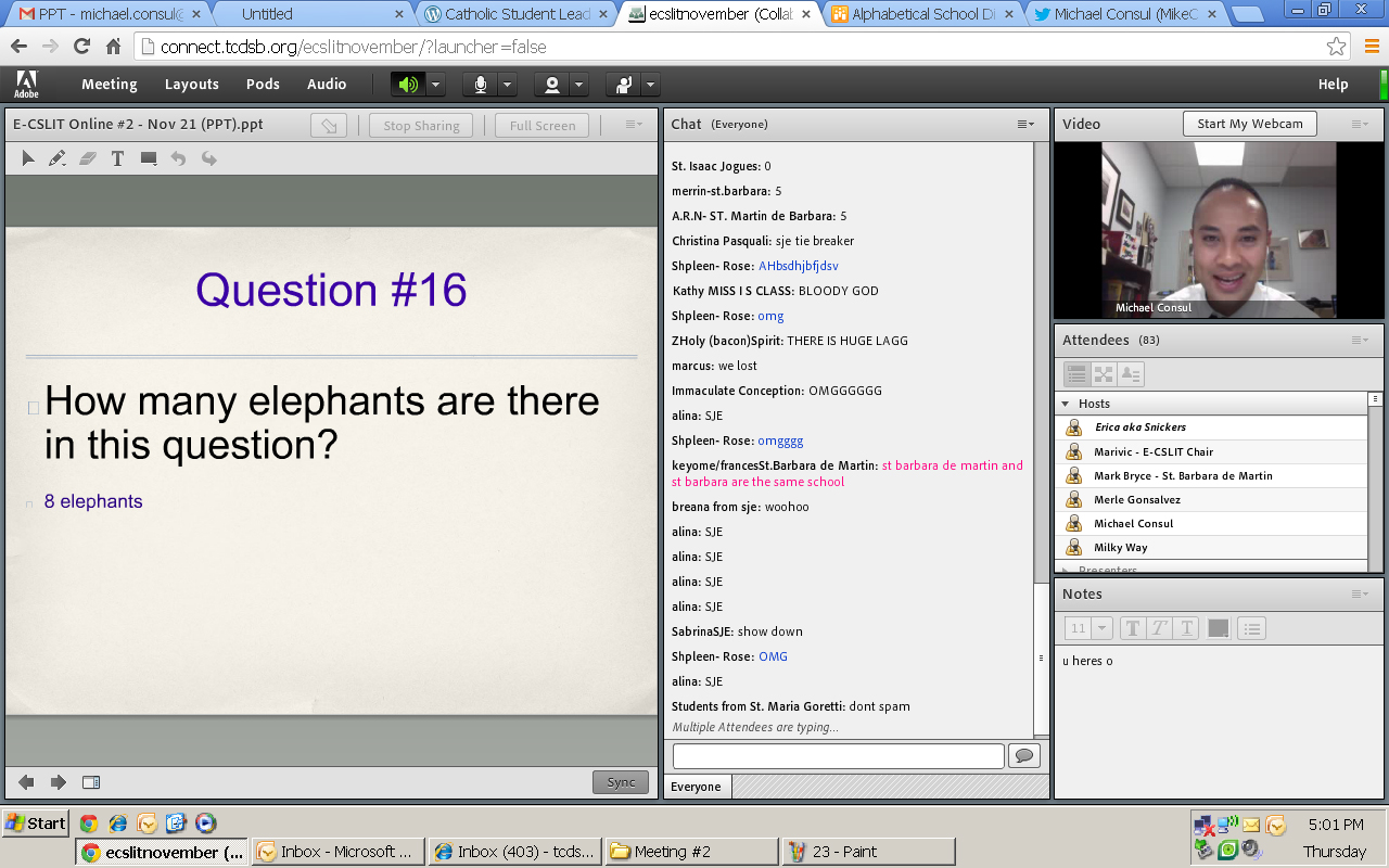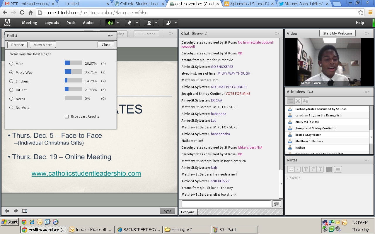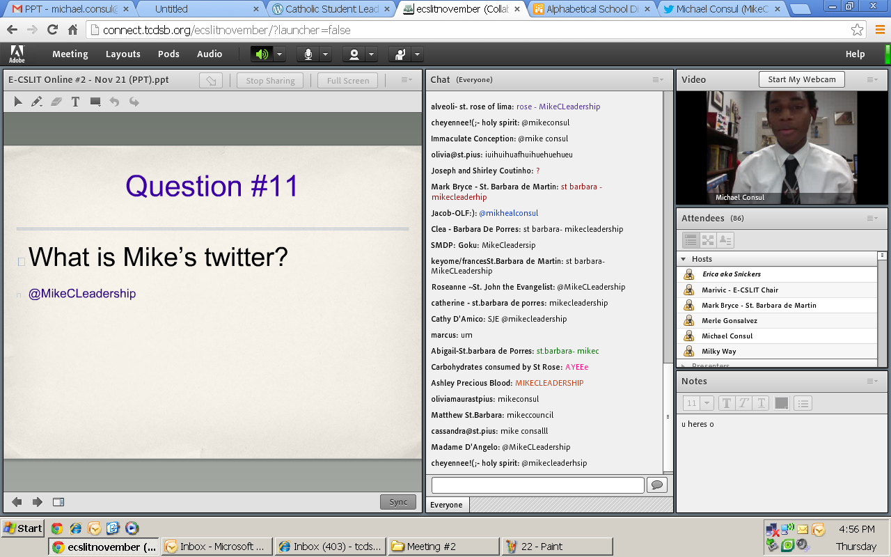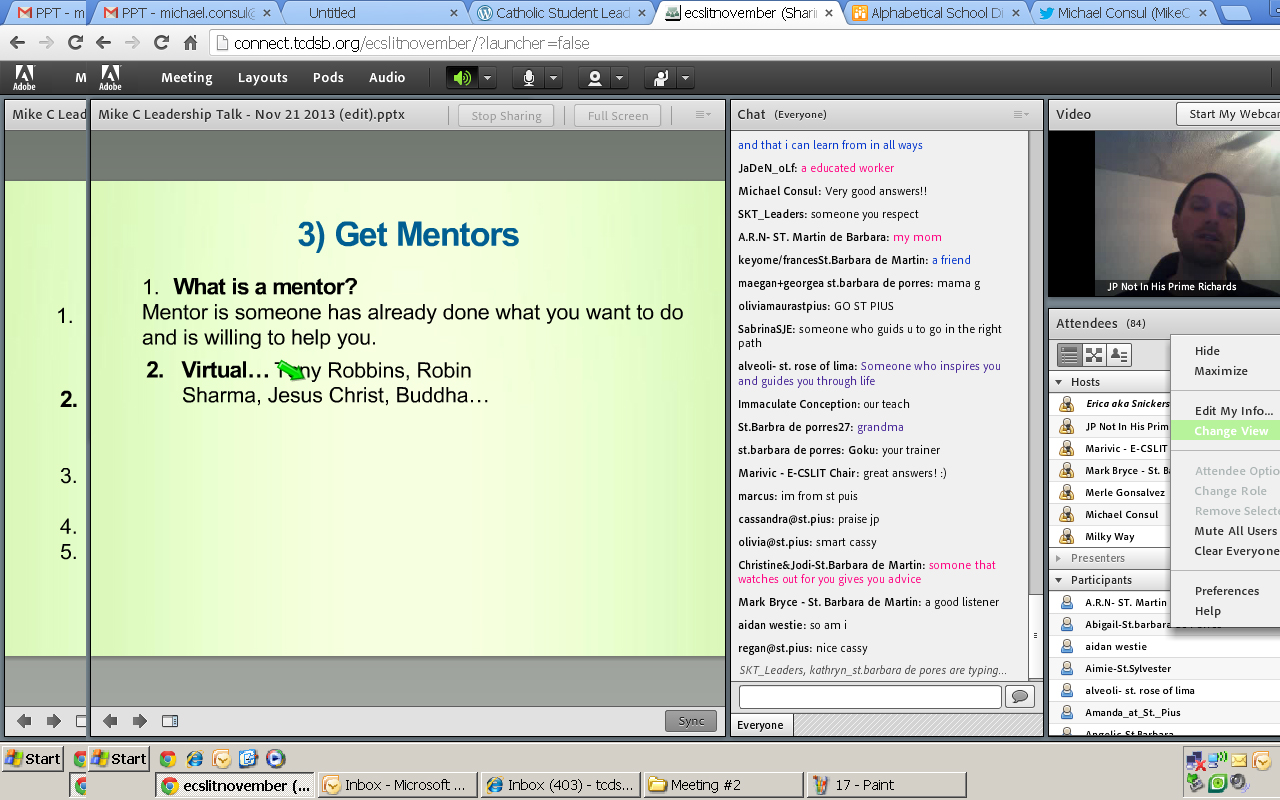 Everyone was AMAZED by Mike’s magic trick. Including me!Mike introduces our guest speaker: JP Richards! (Do you remember who he is? Hint: Look at the first online meeting post ;))Welcome JP Richards to our online Minga!JP Richards explains who he is!Believe it or not but that’s JP. Amongst other things, JP is the founder of Running Dead (Toronto Zombie Walk)JP Richards tells everyone the four keys of success!The first key to success: Get Paid for something you LOVE doing. “Pay” could come in the form of knowledge, fun, experience, contacts, and opportunity.There was a poll asking “Who do you think is younger? Mike or JO?” And E-CSLIT voted Mike C is younger! Do you agree?The second key to success: Solve other people’s problems.“Take a job for what you’ll LEARN not earn.” Knowledge and experience is more important than money. (Do you know who that man is in the picture? Leave a comment below)The third key to success…. can you name it?Who are YOUR mentors? Leave a comment below!Two great examples of mentors are…… MIKE AND GREG 🙂A quick recap of all the keys to success. Thank you so much JP for speaking and sharing your knowledge and experience.Time for the game: 16 questions. Snickers asks, “What is November’s virtue of the month?”It’s the Milky Way asking “What is Mike’s twitter?” (Follow @MikeCLeadership for knowledge, insight and motivation)Mike asks the last question……it seems like this last question is becoming a tradition.Time for student best practice! St. Martin De Porres shares some of the awesome leadership initiatives they are doing at their school.