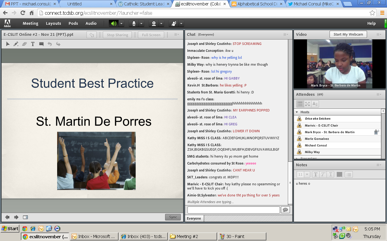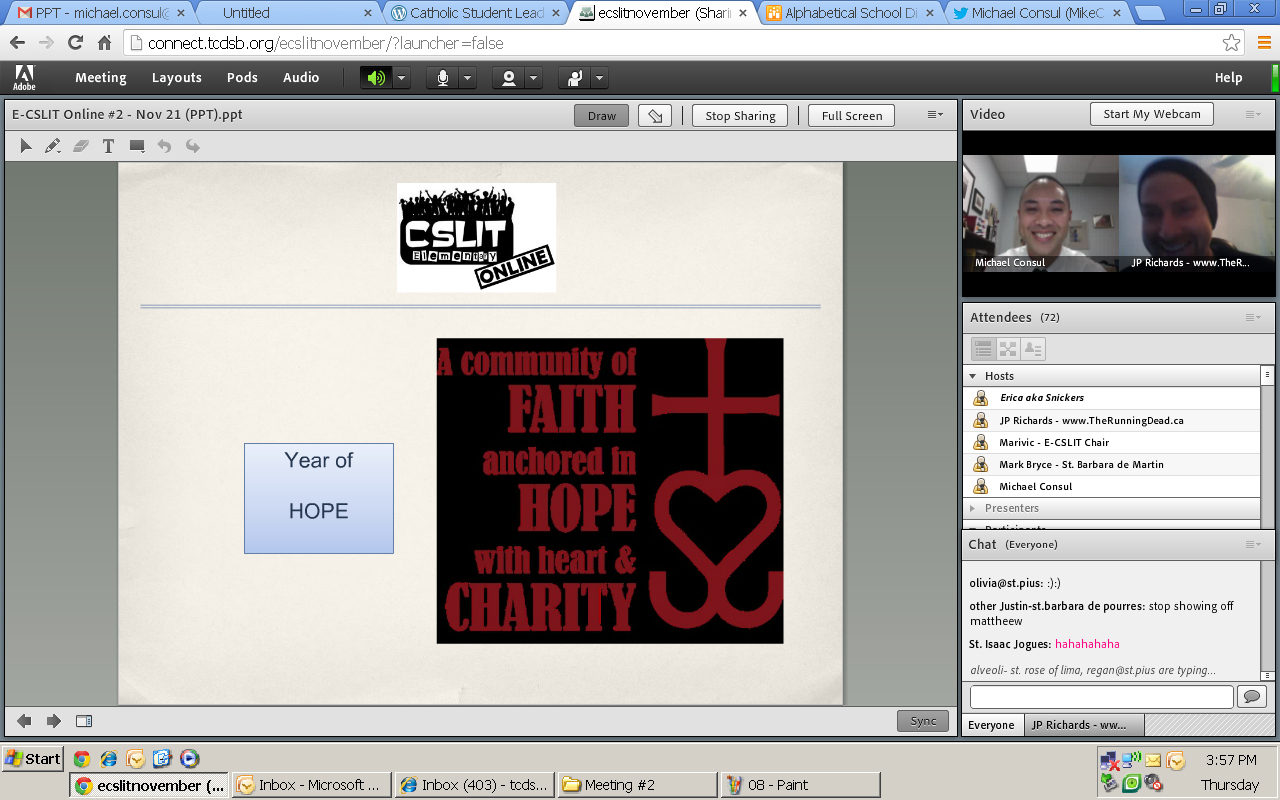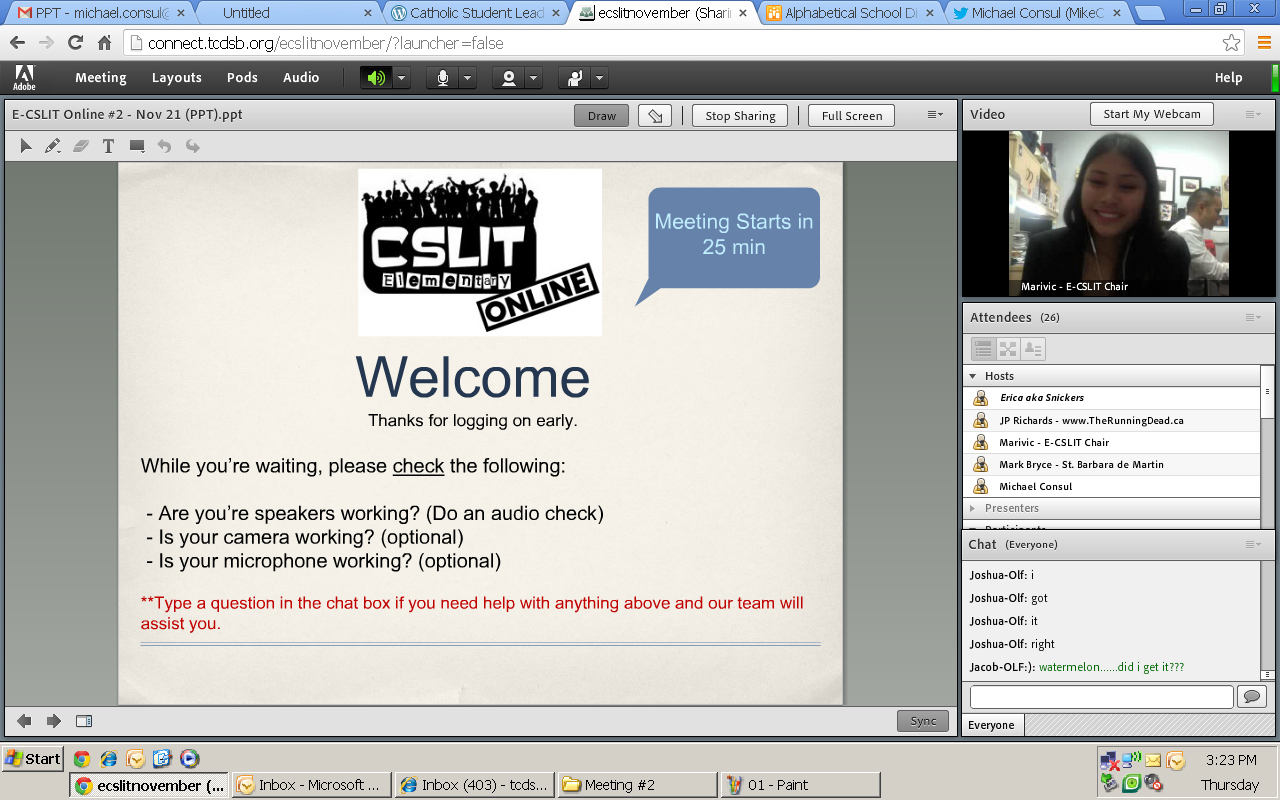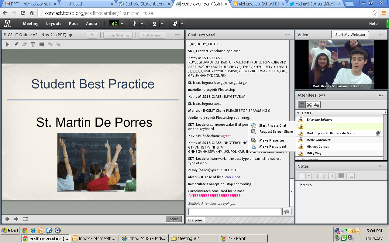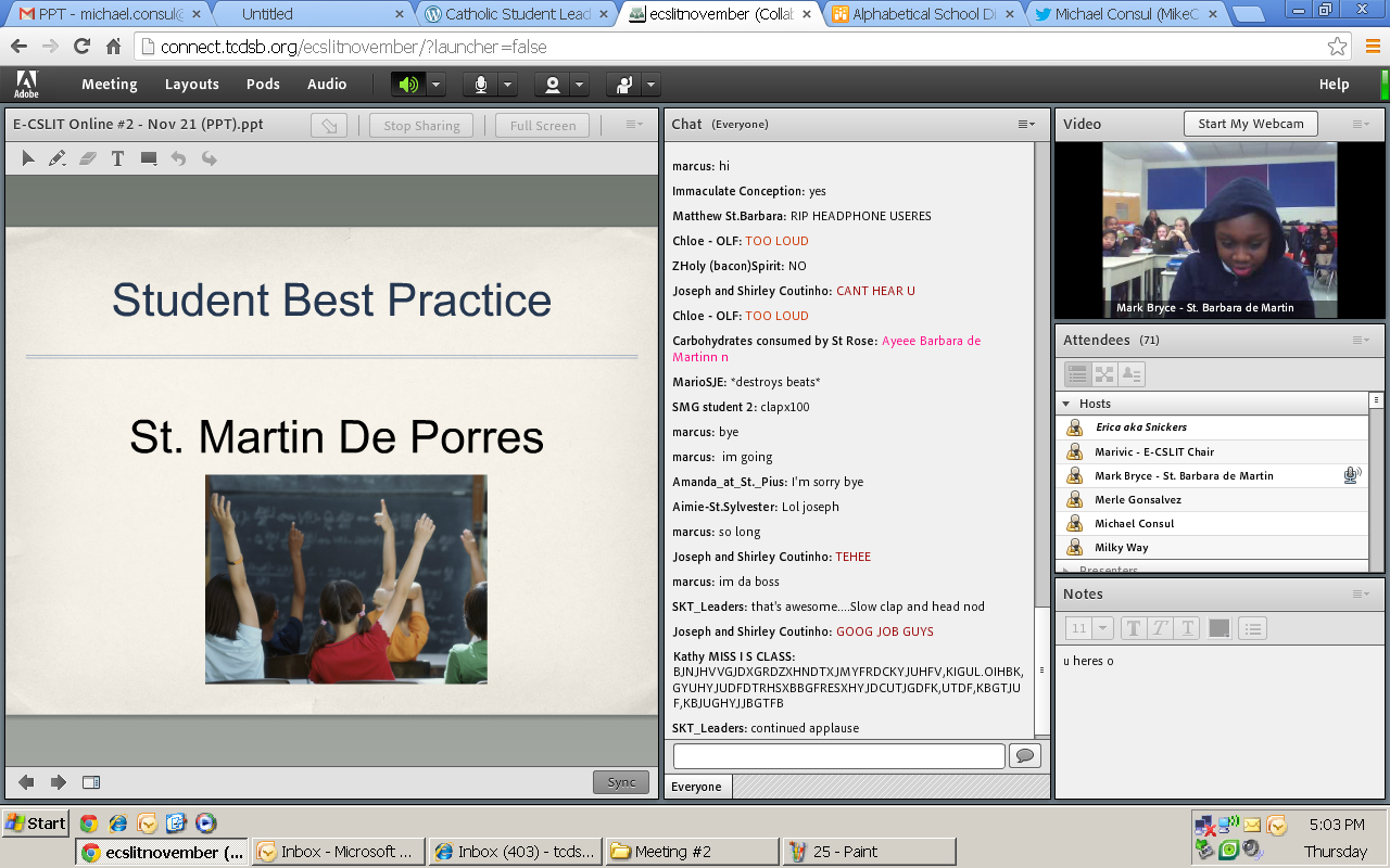 Everyone was AMAZED by Mike’s magic trick. Including me!Mike introduces our guest speaker: JP Richards! (Do you remember who he is? Hint: Look at the first online meeting post ;))Welcome JP Richards to our online Minga!JP Richards explains who he is!Believe it or not but that’s JP. Amongst other things, JP is the founder of Running Dead (Toronto Zombie Walk)JP Richards tells everyone the four keys of success!The first key to success: Get Paid for something you LOVE doing. “Pay” could come in the form of knowledge, fun, experience, contacts, and opportunity.There was a poll asking “Who do you think is younger? Mike or JO?” And E-CSLIT voted Mike C is younger! Do you agree?The second key to success: Solve other people’s problems.“Take a job for what you’ll LEARN not earn.” Knowledge and experience is more important than money. (Do you know who that man is in the picture? Leave a comment below)The third key to success…. can you name it?Who are YOUR mentors? Leave a comment below!Two great examples of mentors are…… MIKE AND GREG 🙂A quick recap of all the keys to success. Thank you so much JP for speaking and sharing your knowledge and experience.Time for the game: 16 questions. Snickers asks, “What is November’s virtue of the month?”It’s the Milky Way asking “What is Mike’s twitter?” (Follow @MikeCLeadership for knowledge, insight and motivation)Mike asks the last question……it seems like this last question is becoming a tradition.Time for student best practice! St. Martin De Porres shares some of the awesome leadership initiatives they are doing at their school.