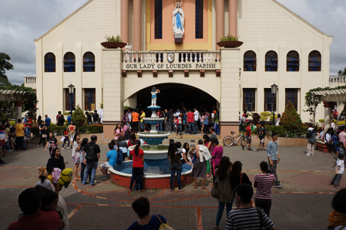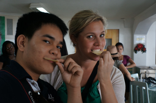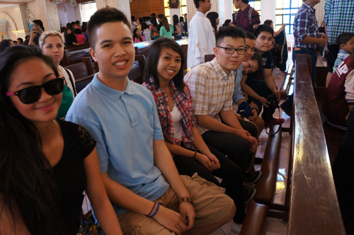 Spoke too soon, that’s a 2 hour drive WITHOUT traffic!Good time to get some shut-eye. This is what a student leader looks like when their last sleep was way back in TorontoStreet vendors take advantage of the traffic as they weave in, out, and between carsBoiled Peanuts anyone?During the drive, we were able to see some beautiful scenery. Believe it or not, these are pineapple fields.First stop: A beautiful sanctuary where the Canossian sisters live and do their workWe are welcomed by Sister Haydee Librojo, Mike and Bernie’s dear friend who use to work at both St. Barnabas and Our Lady of Assumption. “Mano Po” (a Filipino sign of respect shown to those older than you are)The landscapes and architecture here at the sanctuary are beautifulSister Haydee shows us aroundA very easy place to ground yourself and open your spiritualityAnd a perfect place to take a pictureAnd a selfie!Now we know why we travelled all the way to Tagaytay!Simply beautifulJeffery! (Jairuz is rubbing off on you)Imagine living here.We met and conversed with a group of ladies discerning to enter the life of the church. Their lives and background were so diverse.Now off to get some snacks prepared for us by the sistersBut first another photo-opBefore heading upstairs for some refreshmentsMany of us were introduced to this white fleshy fruit called guyabanoThis is what Guyabano (aka sour-sop) looks like uncutMark (aka Father Balano) seems to like this super anti-oxidantNicole on the other hand…… 🙂We were also treated to some delicious Lengua de Gato (translated as “cat tongue”) which tasted like shortbread cookiesAnd Kyla-Anne’s favourite: SkyflakesAnd no Filpino merienda (translation: day time snack) is complete without Milo to drinkWe thank sister Haydee for her hospitality and words of wisdom: “How you do anything, is how you do everything.” “Name it, claim it, tame it, then aim it.”Next stop, mass at Our Lady of Lourdes parishThe church was packed. We arrived just as the previous mass was just about to endStanding room only for the 10:00 am massLuckily because we arrived early for the 11:30 mass, we were all able to get a seatMass was 1.5 hours long but felt like an hourThe boys get to play some b-ball back at the spiritual centre as the girls change from their “Sunday Best” into some more recreational clothingUp next: Skyranch amusement parkThe home of Philippines’ tallest Ferris wheelYou can’t tell from this picture but Erica is freaking out!Gorgeous view of Taal Volcano from the top of the Ferris wheelLunch time aka chicken time (again!) Why they chose KFC beats me 🙂No where to sit so let’s use the floorKFC isn’t KFC without kanin (rice) – Toronto take note!Next stop, Picnic Grove to do some horseback ridingYou’re smiling now, wait till your rear end gets soreLet’s giddy-up!Jairuz: Hey Kyla-Anne, I bet I can beat you in a raceShaelyn, Erica, and JoeLindsay posing as she gets her helmet adjustedHorseback riding, beautiful landscape, a sunset, what can be better than this?I know, a foot spa!Tickles like crazy but a highly effective exfoliant!Shaelyn, you can do it!Let’s take a closer look at what’s really going on down thereKeep your feet in!The funniest picture ever!Everyone in the spa was deaf after Danielle’s screams!Everyone is finally getting used to the sensationThe foot spa even comes with a foot massage – Jairuz, wake up!Relaxing for Jairuz but still ticklish for AlannaAnd same with ShaelynJoe on the other hand loved the special treatmentAwww, time to relax