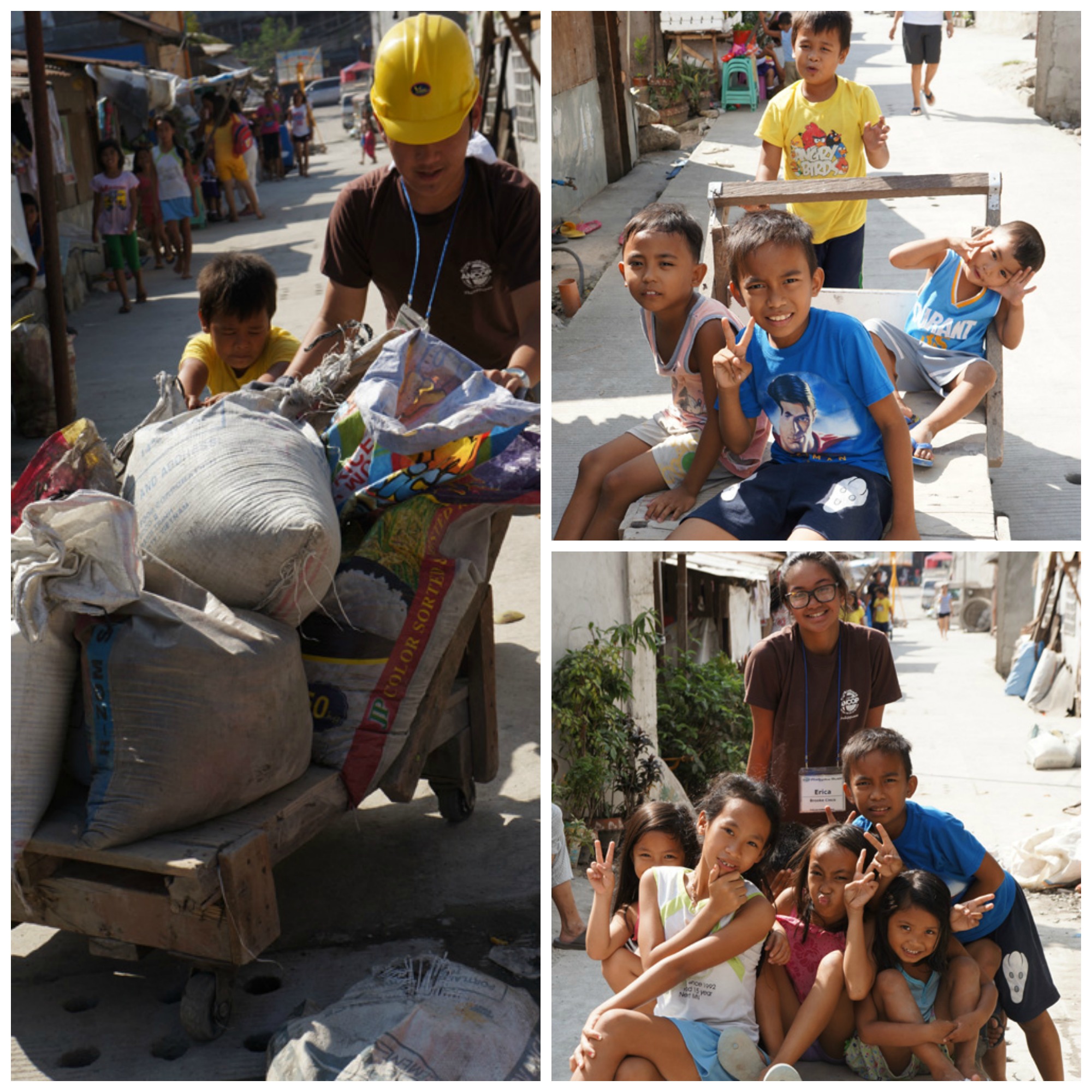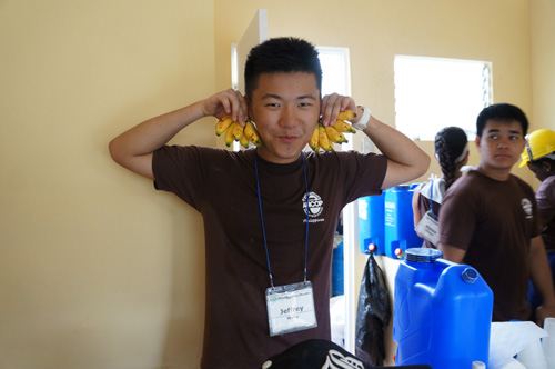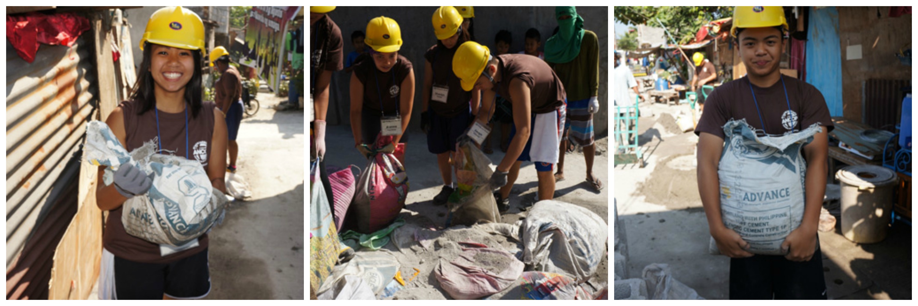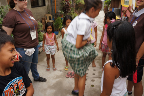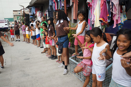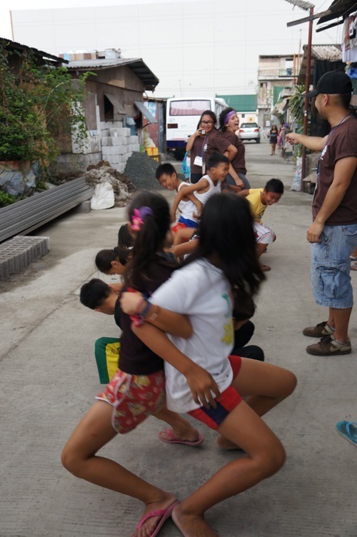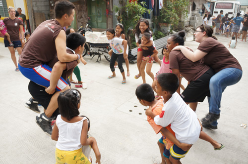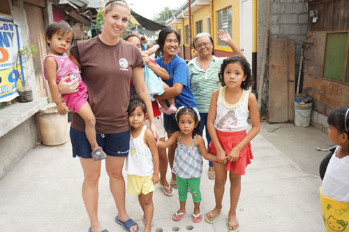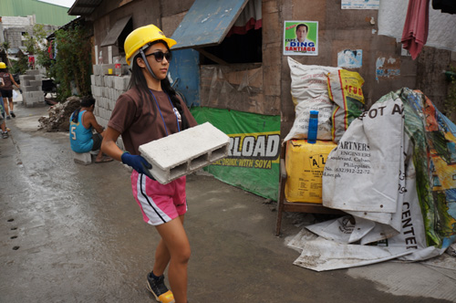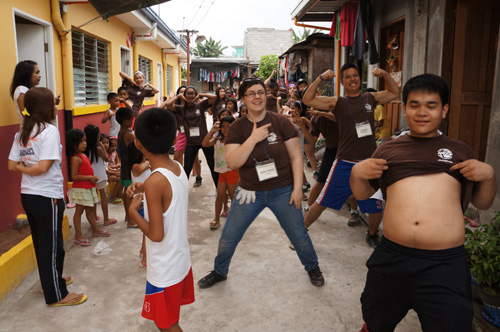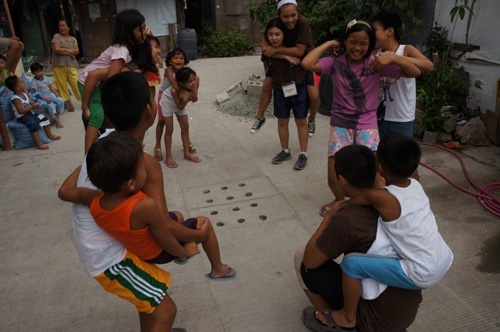 Being greeted by everyone as always as we wave to all the kids that come to meet us 😀The kids are EAGER to see the leaders and teachers!Leaders are giving children high fives as they walk out of the busThe children are excited to be with us another dayWhy are these kids sooooo cute!Melissa, Britishawna, and Katrina posing with their matching 30 hr famine shirtsThe leaders come together for a “mabuhay” cheer before we start buildingMy fellow leaders and I walking to build site, ready to get our BUILD ON!Fierce walking~!Step 1 – Fill bags with sand at the bottom of the hill (make sure they are light enough for Erica to carry) 😀Step 2: Cart sandbags up the hill. Give kids ride when going back down hill to pick up more sand bagsStep 3: Carry sand bags and concrete to mixing areaStep 4: Mix light coloured concrete and dark coloured sand so that it’s one consistent colourStep 5: Make a volcano that can to hold waterStep 6: Add water (and let it cook for a bit – at least that’s how the workers described it to us)Step 7: Mix it all up until it has a consistent smooth textureConcrete mix now ready to be filled into buckets. Student leaders leave their mark in wet cementThese are the original materials that the houses were built fromMy favourite job is pushing the cart up the hill. With kids is even better!This is a picture of me. Doing, umm, yeah…. I don’t know what I’m doingPeace signs from the kidsDanielle and the leaders make cards for our supporters back in Toronto (sponsors, teachers, family, etc).It was a fun process with the children to make all the cardsThese kids were very artisticDanielle is helping them to write and spellThe leaders are doing the same – Alyssa and Alanna would make great teachersDuring lunch Tito Bernie eating exotic Filipino delicacy called balut (Developing shelled duck fetus, boiled, then salted…..yummy) (Yea right!)Katrina leading the passing line for hollow blocksDon’t drop that thun thun thun ehhh~~Nicole solo carrying a hollow brickThis is me multi-tasking. Praying that I don’t drop anythingBritish doing some fancy block stackingHot potato pass it on~Jay reaching to send the hollow block (working off that pandesal)Kyla-anne posing with some kids who are getting ready to go to schoolUniforms are so cute – afternoon school shift is from noon to 6pmJay carrying one of the construction workers up the cliff and sweating like crazyDo you like my banana earrings. Jay don’t be jealous 😉Welcome to the gun show – Fierce!Now flex even harder boys!Grace before meals as always – food looks deliciousThe children teach us the jumping rope gameJairuz gives it a tryStarting off low and easyBring it up a bit!Waist level? How high can you go?The kids are so good at this game!Alyssa is the expert among the group of leadersMichael joins in on the action!Lindsay gets a special gift from one of the childrenThis is Ryzza – everyone just loves her!Jay bending to pick up a hair tie during Filipino style hopscotchHe’s off againJay using his crazy hopscotch skillsErica shows her own skills in hopscotchIn the Philippines you can order pop, but instead of it being poured in a cup, they serve it in a bagDanielle takes a picture with this adorable childKyla-anne is invited into one of the homes as she plays with the kidsAfter our lunch break, we teach “I Gotta Feeling” dance to the childrenI gotta a feeling~Wooo-ho0o!That tonight’s going to be a good nightStep, 2, 3, Clap!Meanwhile during our dancingDuring this part of the dance, everyone picks their own pose. Jay flashes his pandasel (his nickname for his stomach). He thought that we wouldn’t get a picture of it but Mike is fast with his camera.Danielle hugging Joshua, the child she has decided to sponsorTime for some piggy back races. Nicole, Kyla and Jeff are up first. The winner is……NicoleNext up, Mark, Joe and British. Marc Anthony is the victorShea, Alyssa and Alanna are up next. Alyssa comes out as the winnerThe last group is Mike, Kat, and Mel……Melissa is victoriousSenator Tobias Enverga and his family with MikeSenator Tobias Enverga was a former school board Trustee in ScarboroughSenator Enverga is the first Filipino to hold the position of Senator in CanadaSenator Enverga “looks up”Next game we play is Buggies UpThis is what “Buggies Under’ looks likeKyla-Anne doing her best to lift Melissa. Hang in there Melissa~Last to “Buggie Up” is eliminatedNext game: snakes and laddersKids race to see who gets back to their seats firstTeam 1 on the left gets the pointShaelyn in the leadNext game: Pass the Pisil (aka Squeeze)First to high-five Jairuz wins a point for their teamNext game: back to back sitMark and Katrina partner upAnd so do Nicole and IFirst to get up on the count of 3 winsOne……two…………THREE“Are you two cheating?”Mike points at the winnersSenator Enverga gets involved in the next gameObject, try to grab the person’s finger with your left hand and at the same time try to avoid being caught with your rightOnly move your hands when we say the word “canin” (rice in Tagalog)Alyssa tells a story, “There once was a boy named Mike, and his favourite food was canin.” (Move finger, and close hand)Last group shot before Senator Enverga departsNext, Lindsay leads us in a repeat after me song (as it starts to rain)Danielle is up next and teaches everyone the “Boom, chicka, boom” song. This is how it’s done under waterThis is robot styleErica teaches the song, Down by the bayTime for snack before we depart for the day….Pandesal of course and hot cornBefore we leave, Danielle gets a special giftThis is what’s written at the back of the pictureHardhats lined up for tomorrow and we’re ready to goLindsay takes one of her 100 daily photos before we leaveOur customary escort as we walk back to the busKids are with us every step of the waySome even ask for a piggy backFinal high-fives as we say goodbye for the dayThey make us not want to le