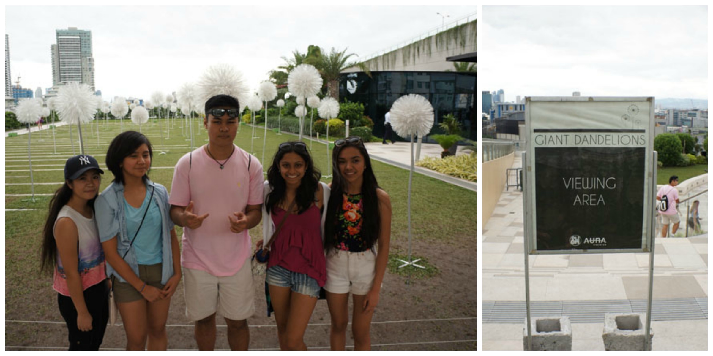 Faith, Emily, John, Nicole and Dyan posing in front of the Giant Dandelion art installation.