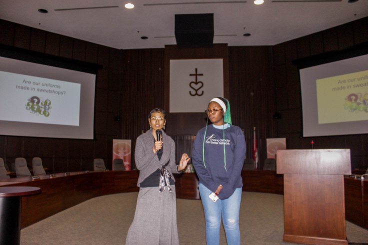 After Mr. McGuckin’s address, Ms. Audrey Ferrer and Ms. Celia Ieradi, teachers from Madonna C.S.S as well as members of the Ontario Catholic No Sweat Network gave students a presentation on the social justice issue of sweatshops.