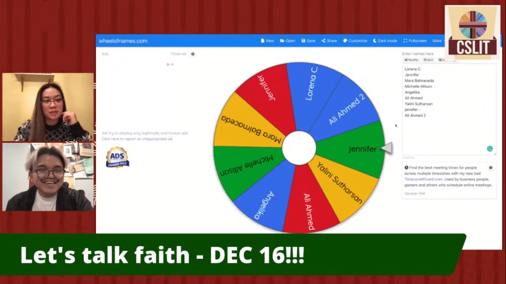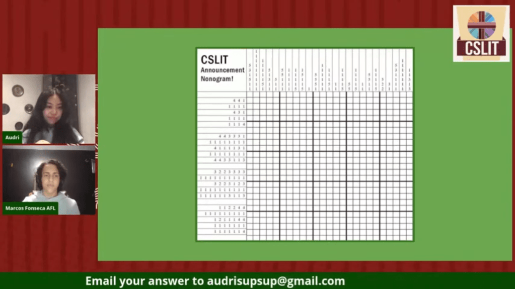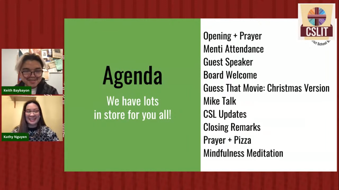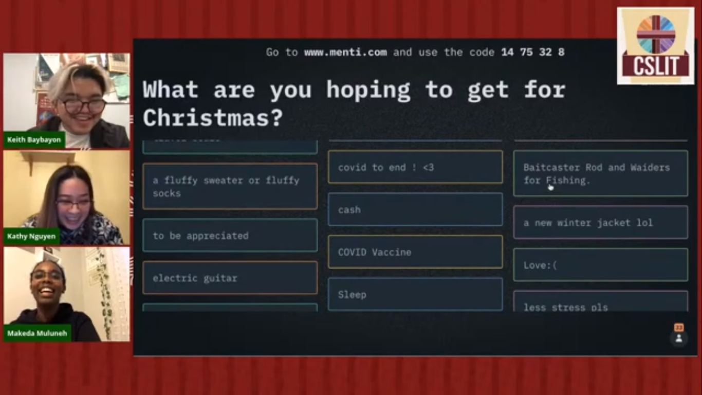 It’s game time!!! CSLIT Exec members Stephen Chiu and Junette Tindan tried to guess the titles of each Christmas movie based on the clues shown on the screen. Student participants who answered correctly in the chat box have a chance to win a box of pizza delivered to their doorstep. Can you guess what Christmas movie this is? (Answer revealed below).