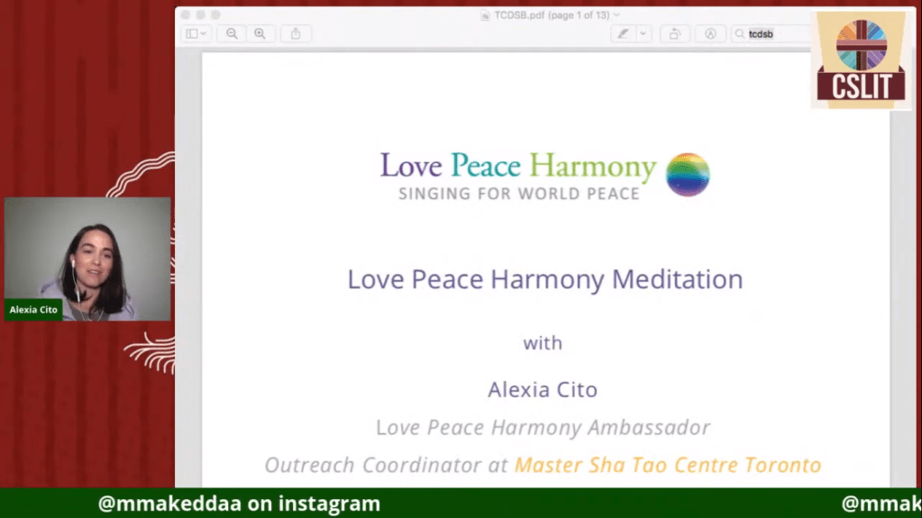 After each CSLIT meeting, students are welcome to stay behind and join us in a meditation by TCDSB alumni Alexia Cito from Love Peace Harmony.