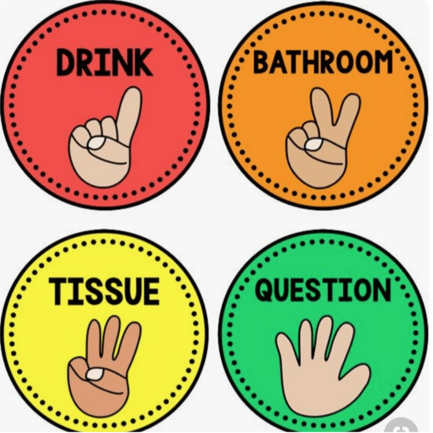 Having taught as a hybrid virtual and face-to-face teacher, using hand signals within the virtual and physical classroom has been a hit! The concept of hand signals entails students raising a certain hand gesture to relay what they need or would like to say or ask. This has helped prevent students from blurting out as it is an additional thought process to relay what they need to covey to the teacher.