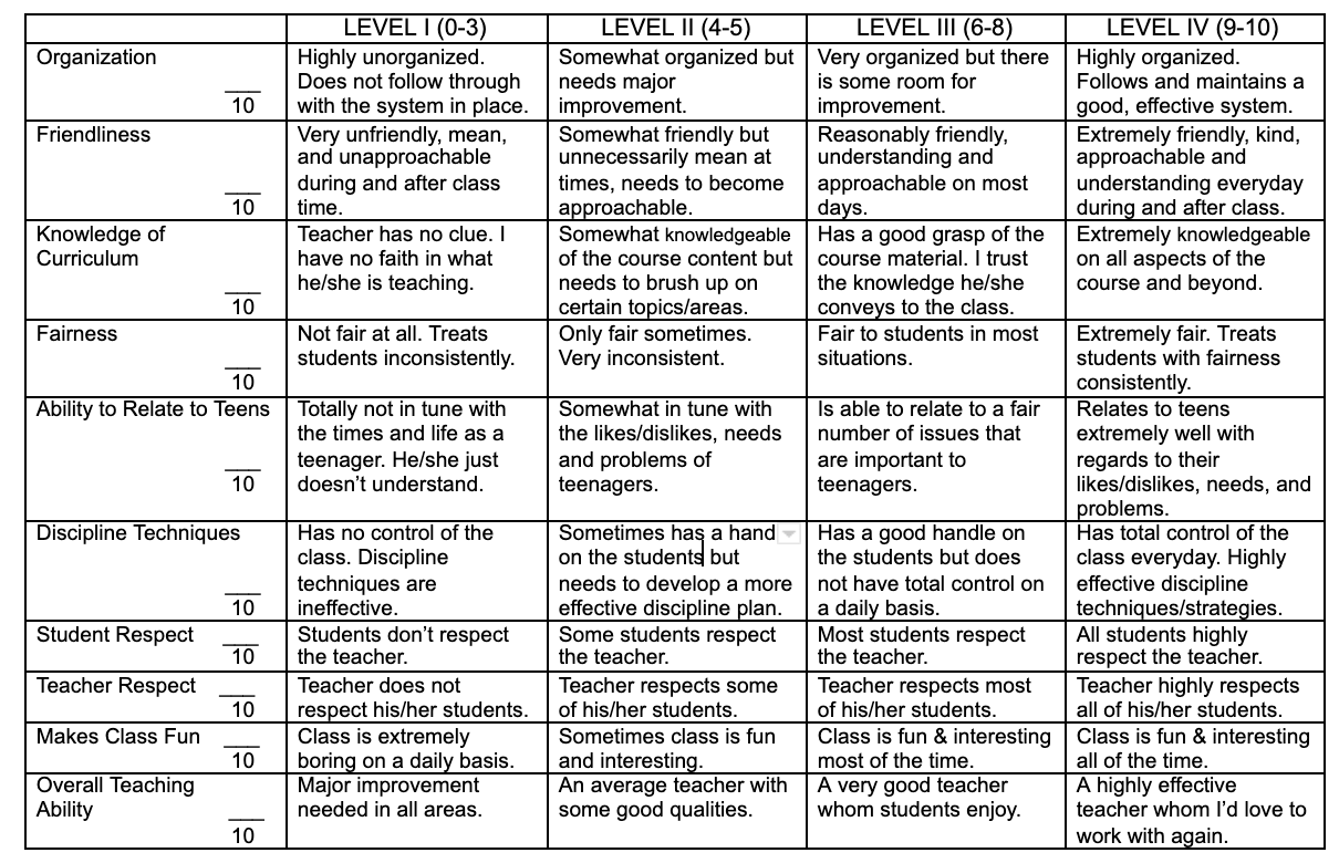 The best evaluators of your teaching performance are your students. Many moons ago I received provincial best practice award for developing this teacher rubric. In short, it’s an evaluation that students complete on YOU!!
