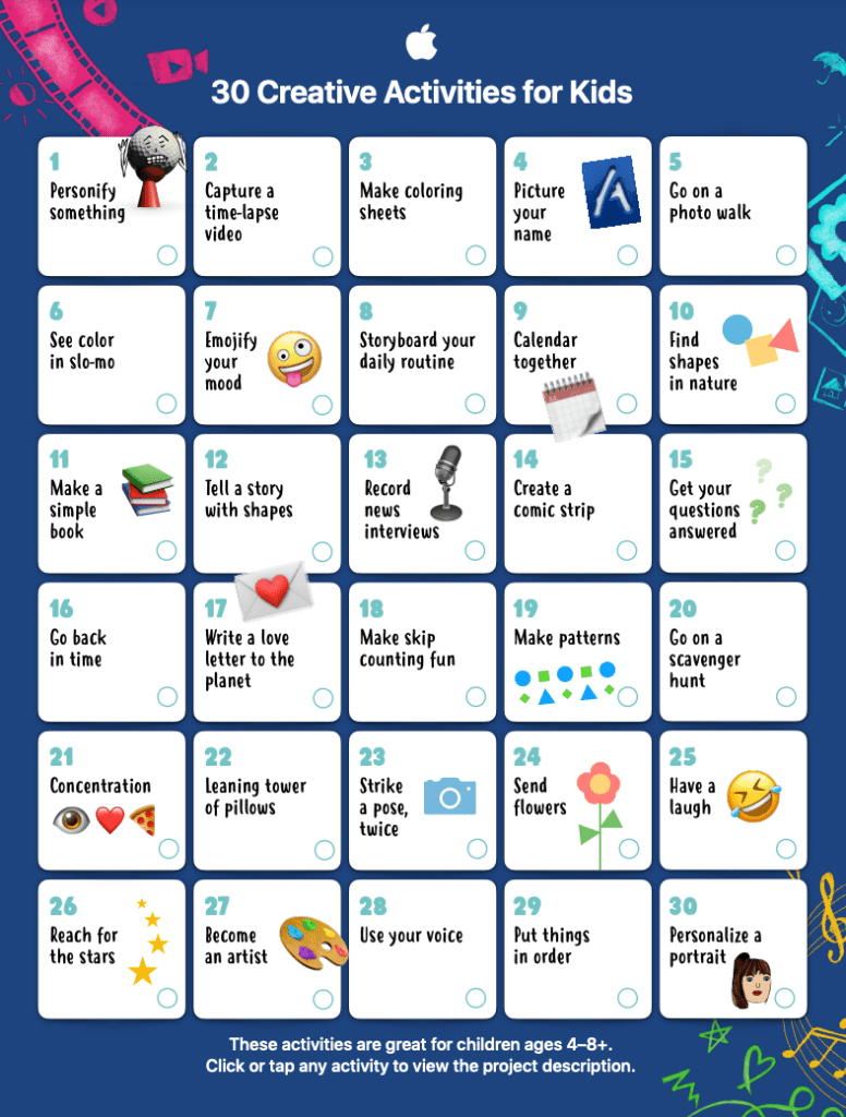 Coinciding with this, is a series of 30 Creative Activities.  Each of these activities takes very little time to perform so building them into your virtual lessons, not only motivates students with experiential learning sessions but it breaks up the monotony of reading, writing, and teaching from a slideshow.  From personifying an object, to slow mo videos of pillow towers falling, these activities cleverly build in STEAM-based learning opportunities that awaken student senses.  Try a few or give the entire workbook a whirl.
