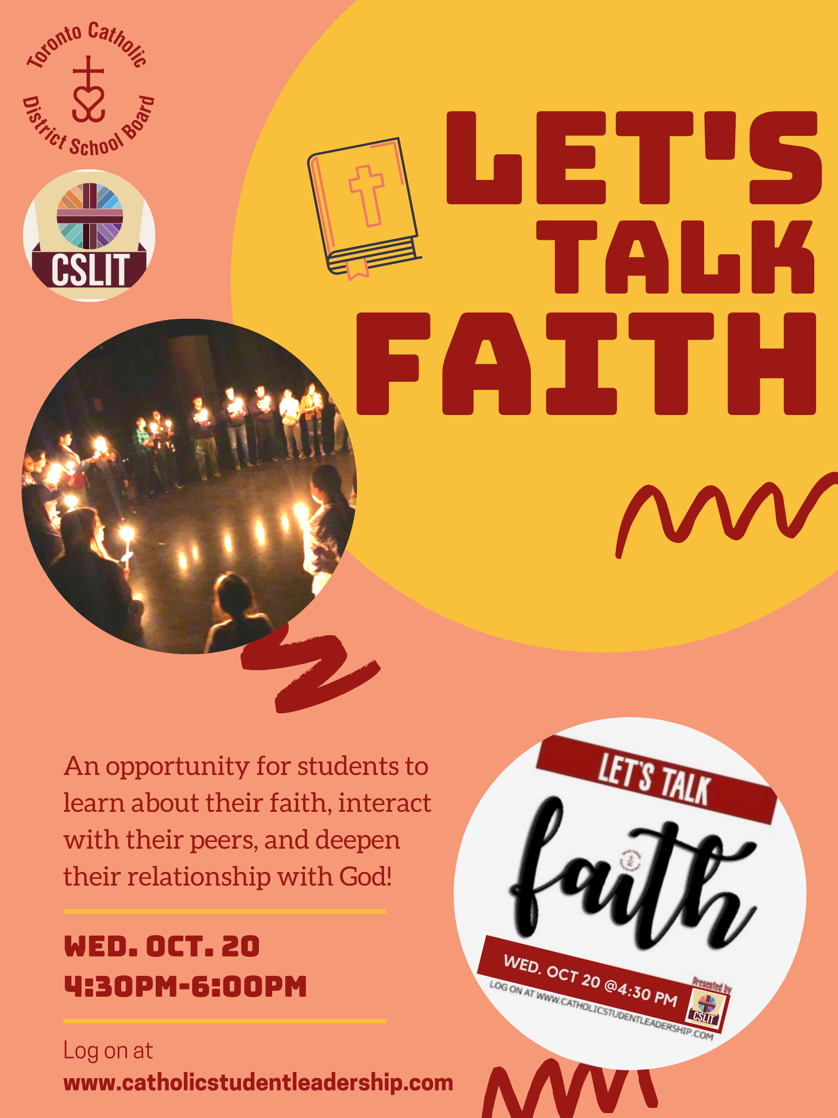 Interact, discuss, and pray with Catholic student leaders across the TCDSB as we explore topics to deepen our faith and strengthen our relationship with God.
