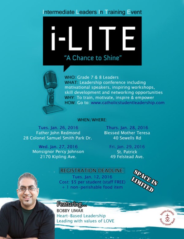 On March 1st, 2013, the Catholic Student Leadership department of the Toronto Catholic District School Board hosted it forth of 4 iLITE student leadership conferences at the beautiful Blessed Mother Teresa C.S.S. BMT is our longest standing and always the biggest of all of our iLITE events: 567 students, from 21 schools, 36 teachers, 26... Continue Reading →